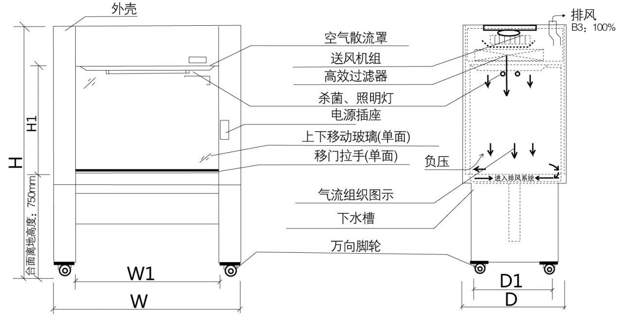 從箱體頂部吸入空氣,在送風風機驅動下,將空氣送入靜壓箱經高效過濾器過濾后送入安全柜操作區(qū)。下降氣流和安全柜操作區(qū)開口面吸入的空氣相混合后經外排風道在中央排風系統(tǒng)或外置排風風機的驅動下,經排風過濾器過濾后排到室外。